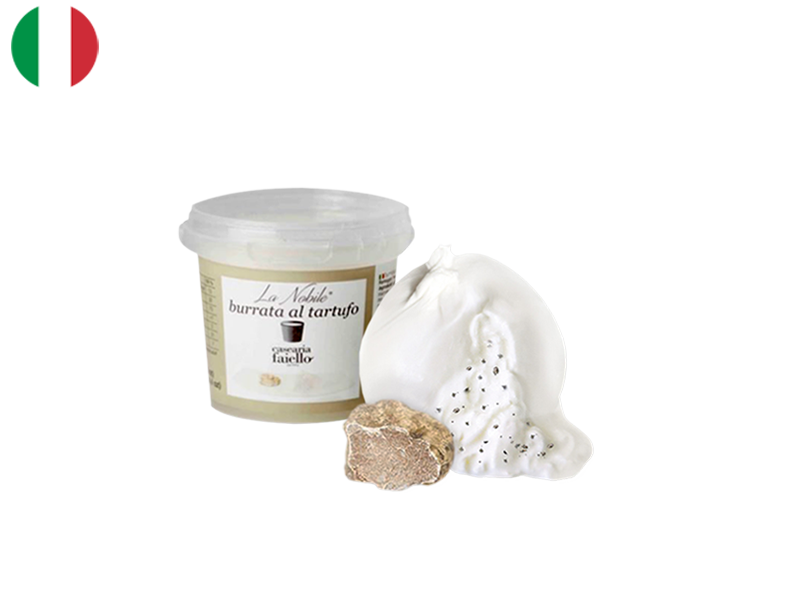First produced by the Bianchini Family in the region in the 1920s, Burratina is prepared as a Mozzarella. The difference is its white filled paste gets some pieces of cream inside called stracciatella. Now, this Truffle Burratina has its stracciatella sparkled with Black Truffle fragments. Soft, creamy, and delicate, this Burratina, smallest version of Burrata, is perfect to eat as an appetizer or on its own.